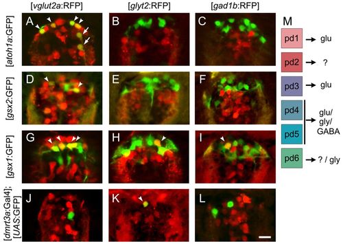 Neurotransmitter properties of neurons derived from dorsal progenitor domains. All images were taken from fish that were 3.5 dpf. All images are cross-sections of the spinal cord. Transgenic fish genotypes are shown at the top and left. Arrowheads and arrows show cells that are positive for both GFP and RFP. (A-C) atoh1a:GFP neurons are positive for vglut2a:RFP. (D-F) gsx2:GFP neurons are positive for vglut2a:RFP. (G-I) All three types of neurons (vglut2a:RFP, glyt2:RFP and gad1b:RFP) are present among gsx1:GFP neurons. (J-L) A GFP neuron driven by dmrt3a:Gal4 is positive for glyt2:RFP. (M) Summary of the neurotransmitter properties of neurons produced by dorsal progenitors. Scale bar: 10 μm. |