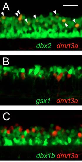 dmrt3a-positive neurons derive from the pd6 domain. Images are lateral views of the spinal cord at 3.5 dpf. (A)Tg[dbx2:GFP] and Tg[dmrt3a:RFP] compound transgenic fish. All the dmrt3a:RFP neurons are positive for dbx2:GFP (arrowheads). (B) Tg[gsx1:GFP] and Tg[dmrt3a:RFP] compound transgenic fish. None of the dmrt3a:RFP neurons is positive for gsx1:GFP. (C) Tg[dbx1b:GFP] and Tg[dmrt3a:RFP] compound transgenic fish. None of the dmrt3a:RFP neurons is positive for dbx1b:GFP. Scale bar: 50 μm. |