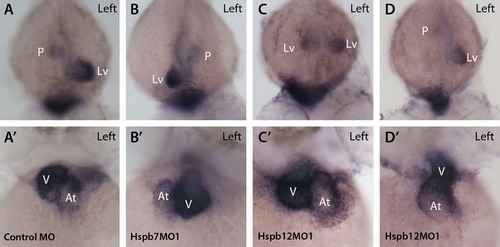 Concordance of asymmetry between heart and gut in hspb7 and hspb12 knockdown embryos. (A-D) Dorsal view, rostral toward bottom, left side as indicated in (A). Expression of foxa3 is strong in liver (Lv) and weaker in gut and pancreatic bud (P) at 48 hpf. (A′-D′) myl7 (cmlc2) is strongly expressed in ventricle (V) and more weakly in atrium (At) at 48 hpf. Anterior view, left side as indicated in (A). (A, A′) Control MO-injected embryo demonstrated the normal position of atrium to the left of the embryo′s midline and of the ventricle on the right (dextral loop). foxa3 is concentrated in the normal, left-sided liver and weaker in the pancreatic bud in control MO-injected embryo. (B, B′) hspb7 morphant with right-sided liver and ventricle. (C, C′) hspb12MO1-injected embryo with bilateral liver but normal position of the atrium and ventricle. (D, D′) hspb12MO1-injected embryo with left-sided liver and a heart that failed to jog or loop (midline heart). |