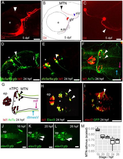 MTN neurons are the first differentiating neurons in the dorsal midbrain and innervate jaw muscles. Lateral view (A) and schematic (B) of 5 dpf zebrafish larvae with DiI (red) applied to the a.m. muscle showing labelled axons and MTN neurons (arrowheads) in the midbrain. Dorsal view (C) of DiI-labelled MTN neurons reveals a single axonal process that splits into two branches (arrowhead). Lateral views of 24 hpf Tg[dlx5a/6a:egfp] embryos with nTPC (asterisk) and MTN (arrowheads) labelled by GFP and Isl1 (D,E). Dorsal view and schematic of 24 hpf embryos with anti-Isl1 and acetylated tubulin (AcTu) labelling reveal that MTN neurons (arrowheads) pioneer the dtmesV (blue) and that nTPC neurons (asterisk) contribute to the mlf (purple) axon tracts (F,G). Dorsal views of 24 hpf embryos reveal that MTN and nTPC neurons are positive for Isl1 and Elavl3 (HuC) and express GFP in a Tg[elavl3:gfp] transgenic line (H,I); by contrast, more posteriorly located elavl3-expressing progenitor cells do not express GFP at similar stages (I). Dorsal views of Tg[elavl3:gfp] embryos at various stages reveal that MTN neurons (arrowheads) arise at the dorsal midline in the anterior midbrain and pioneer axon tracts ventrolaterally (J-L). A plot of the distance between MTN neurons and the isthmus, corrected for midbrain size, reveals that MTN neurons are formed at progressively posterior positions over time (M). gV, trigeminal ganglia; e, eye; a.m., adductor mandibulae; nV, trigeminal motoneurons; i, isthmus; mlf, medial longitudinal fasicle; ep, epiphysis; MTN, mesencephalic trigeminal nucleus; nTPC, nucleus of the tract of the posterior commissure; dtmesV, dorsal tract of the mesencephalic trigeminal. Scale bars: 100 μm in A,D,F-L; 20 μm in C,E. |