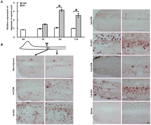 Legumain mRNA expression is upregulated in the caudal spinal cord after SCI. (A) Quantitative real-time PCR (qPCR) shows that legumain mRNA expression increases from 3 days post-injury and remains upregulated at 11 days after SCI. (B) In situ hybridization for legumain mRNA in the caudal spinal cord shows different expression patterns in the lesion site (area with stripes) and the caudal part of spinal cord (area with dots). In the non-injured spinal cord, legumain mRNA is only observed in neurons. In the lesion site, legumain mRNA is observed in many small cells at all time points tested after SCI. In the spinal cord caudal to the lesion site, legumain mRNA is detectable in small cells in both the sham-injured and SCI groups at 1 day, with a stronger signal for legumain mRNA after SCI compared to the sham injury group. At 3 days, while the signal for legumain mRNA in small cells is not detectable anymore in the sham-injured group, strong positive signal for legumain mRNA expression is observed in small cells in the SCI group. At 11 days, more positive neurons are seen after SCI compared to the sham-injury group. No signal is detectable with the sense probe. Rostral is left and caudal is right. A, n = 3 experiments; B, n = 4 fish for each group. * P<0.05, two-way ANOVA with Tukey′s post hoc test; mean values ±SEM are shown. Scale bar, 50 μm. EXPRESSION / LABELING: