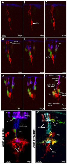 SoFa lines allow precise identification of cell fate within developing clones. (A-I) Time lapse series of a developing SoFa1 clone in an unlabelled wild-type host. We presume this clone arose from a single progenitor cell due to its final size. Imaging started at <45 hpf, corresponding to the time of the appearance of the first gapRFP-expressing cells (Atoh7+) and image stacks were collected every hour. Some Atoh7+ cells differentiate into RGCs, whereas others divide and start expressing gapCFP (Crx+) or cytGFP (Ptf1a+). At the onset of differentiation, it is possible to identify the final fate of these cells before they reach their final position: RGCs (red cells expressing increasing levels of gapRFP, arrow), inhibitory neurons (red and green cells), PRs (purple cells). Crx+ BCs did not yet arise through the duration of the movie: <12 h time-lapse movie; extended focus confocal image, z stack=25.5 µm; step size=1.5 µm. (J,K) Examples of SoFa clones at 76 hpf, when all cell types have differentiated and show their characteristic laminar position in the retina. (J) SoFa1: PRs ( purple); BCs (blue); AC/dAC/HC (red and green); RGCs (red); single confocal image. (K) A SoFa2 clone: PRs (cyan and red); BCs (cyan); AC/dAC/HC (red and yellow); RGCs (red); 3D projection, z stack=40 µm, step size=2 µm. |