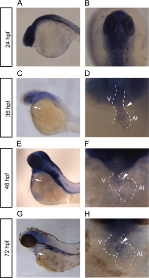 rhoua is expressed in the heart and brain. (A–H) Whole mount RNA in situ hybridization reveals rhoua expression in the zebrafish at (A, B) 24 hpf, (C, D) 36 hpf, (E, F) 48 hpf, and (G, H) 72 hpf. (A, C, E, G) Lateral view of the zebrafish head and torso. White arrow points to heart. (B) Dorsal view of 24 hpf zebrafish head. (D, F, H) Ventral view of heart. Anterior is to the top. Dashed lines outline the heart. Arrowhead points to AV canal. At – atrium, V – ventricle. EXPRESSION / LABELING: