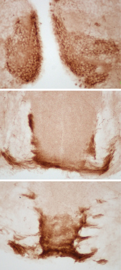 Zebrafish Kiss1 immunoreactivity in the habenula and the median raphe. Immunohistochemistry using a newly generated antiserum to preprozebrafish Kiss1 showed Kiss1 immunoreactive cells in the ventral habenula (vHb; A) and immunoreactive fibers in the ventral interpeduncular nucleus (vIPN; B) and the median raphe (MR; C) through the fasciculus retroflexus (FR). No further immunoreactive fibers were seen after the MR, suggesting that the habenular Kiss1 neurons are terminated at the MR, but not in the vIPN. (Scale bars, 50 µm.) |