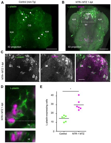 Phagocytic cells are L-plastin-positive leukocytes. (A,B) L-plastin fluorescent marked cells (green) in (A) whole mount stained control (non-transgenic non-treated) and (B) NTR + MTZ larvae at 1 day post-treatment (dpt). (C) L-plastin marked cells in forebrain of NTR animals treated with MTZ 1 day after treatment, showing cytoplasmic mCherry inclusions (magenta) and amoeboid morphology. (D) High magnification of L-plastin-expressing leukocyte, and orthogonal view, showing cytoplasmic inclusions of mCherry in NTR MTZ-treated animals 1 day post-treatment. (E) Quantification of L-plastin-expressing leukocytes within forebrain, in control and ablated larvae 3 days post-treatment, shows twofold increase in NTR animals treated with MTZ (n=6) (*Pd0.05). Z-stacks of ~80 µm were used for quantification. OB, olfactory bulb; tel, telencephalon. Scale bars: 100 μm (A,B), 20 μm (C). See also supplementary material Movie 2. |