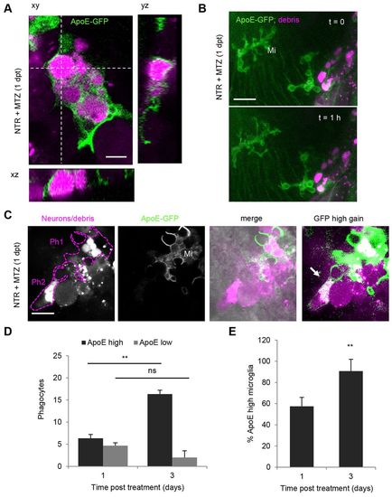 Mononuclear phagocytes are ApoE-expressing microglia and macrophages. (A) ApoE-driven membrane-targeted GFP expression in mCherry-positive phagocytes in NTR-ablated larval brain showing complete internalization of mCherry marked phagosomes.(B) Brain of NTR-ablated larva showing ramified ApoE-GFP microglia next to region of cell death and phagocytic macrophage and microglia. (C) Two mCherry-positive phagocytes in NTR-ablated larvae, one showing membranous ApoE-GFP expression and amoeboid morphology (Ph1), the other showing no membrane staining under normal imaging conditions (Ph2) (also see supplementary material Movies 3, 4). Upon high power excitation of GFP, a low level of ApoE-GFP-expressing population becomes apparent (arrow, right panel). (D) Number of phagocytes in the forebrain of NTR-ablated larvae and fraction coexpressing microglial ApoE-GFP at 1 and 3 days post-treatment. Z-stacks of 50–70 μm were used for quantification. (E) Fraction of ApoE-GFP-expressing microglia from total number of phagocytes 1 and 3 days post-ablation. Error bars indicate standard deviation; n=3 animals for 1 and 3 days post-treatment, respectively; **Pd0.01; ns, not significant. Mi, microglia. Scale bars: 5 μm (A), 20 μm (B), 10 μm (C). See also supplementary material Movies 3–6. |