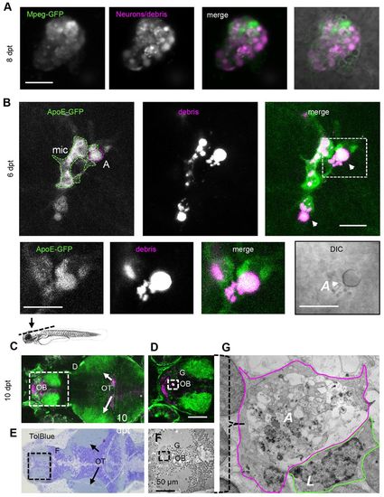 Apoptotic phagocytes are engulfed by microglia. (A) Large mpeg-GFP-expressing phagocyte 8 days post-treatment (dpt) showing cytoplasmic mCherry-positive vacuoles (magenta) and mpeg-GFP expression (green), suggestive of an apoptotic phagocyte. (B) ApoE-expressing microglia (mic; green) phagocytizing non-motile, apoptotic phagocytea (‘A’; magenta, arrowheads) (supplementary material Movie 9). The boxed area is shown below at higher magnification. The DIC image at the bottom right shows that the phagocyte being engulfed by microglia is apoptotic (reflective button-like rounded cell body). Data were recorded using intravital imaging of three distinct channels to visualize NTR, ApoE-GFP and apoptotic cells. The schematic above C indicates the region shown in C and E. (C) Optical section of live forebrain and optic tectum region of NTR animals treated with MTZ 10 days after treatment; green indicates GFP expression (supplementary material Movie 10). (D) Higher magnification of forebrain as shown in C. (E) Toluidine Blue stained section of region of brain of same animal as shown in C. (F) Electron micrograph of region indicated in E. (G) Electron micrograph of phagocytic profile observed in live imaging, showing large apoptotic cytoplasm including vacuoles and lysosomal debris demarcated with solid purple line, partly surrounded by a leukocytic cell (‘L’). ‘A’, apoptotic phagocyte; mic, microglia; OB, olfactory bulb; OT, optic tecti. Scale bars: 10 μm (A,B), 50 μm (D). See also supplementary material Movies 9–11. |