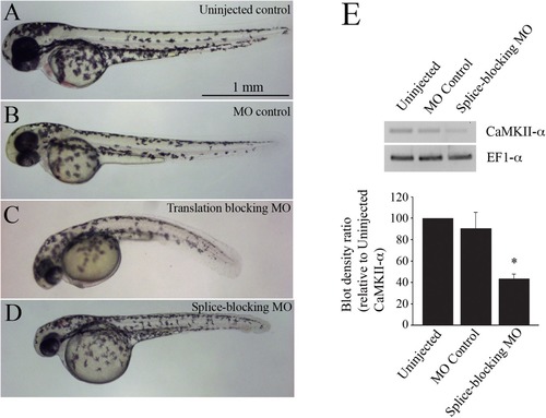 Images of 2 dpf zebrafish. (A) uninjected controls, (B) embryos injected with 4 ng of control morpholino, (C) embryos injected with 4 ng of a translation-blocking CaMKII-α morpholino, and (D) embryos injected with 4 ng of a splice-blocking morpholino. (E) RT-PCR blots of CaMKII-α knockdown assessment. EF1-α was used as a loading control. Quantification of blot densities (n = 5 experiments). |