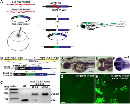 In vivo recombination analysis. (A) Overview of HR detection system by co-injection of TALEN RNAs and a GFP-inserted targeting construct in zebrafish embryos. (B) TALEN target in the sox2 locus and a sox2-targeting construct. Black, gray and blue blocks represent ORF, 5′ UTR and 3′ UTR, respectively (sox2 has no introns). G (0 position, marked in red) just before the stop codon is duplicated in the targeting construct locus and the 2a-sfGFP fragment is inserted in between the Gs. (C) sox2 TALEN RNAs were injected without any donor DNA and its mutagenic activity was measured by PCR and restriction enzyme analysis. Each lane represents an NdeI-digested amplicon encompassing sox2 TALEN target sequence from genomic DNA isolated from five embryos. The NdeI-digested wild-type PCR products are 78 and 75bp. (D-F) Lateral (D) and anterior-dorsal (E,F) views of 2dpf wild-type embryo. Box marks dorsal diencephalon region. (F) Detection of sox2 transcripts by whole-mount in situ hybridization. Scale bar: 200µm. (G,H) Confocal microscope images of the brain region that is similar to that shown in the boxed areas in D-F. (G) An embryo injected with a circular form of a sox2 reporter targeting construct. (H) An embryo co-injected with circular form of the construct and sox2 TALEN RNAs. Groups of cells expressing sfGFP in the diencephalon region are indicated by arrows. Scale bar: 20µm. |