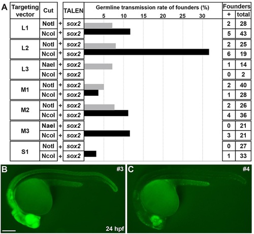 Germline transmission rates of sox2-2a-sfGFP knock-in lines. (A) The frequency of germline transmission of the founders that were co-injected with sox2 TALEN and each targeting construct, which was linearized by either NotI or NcoI. The bars represent the percentage of F0 founders that produced sfGFP-positive F1 progeny. (B,C) Comparison of sfGFP expression between strong and weak sox2-2a-sfGFP F1 embryos. Epifluorescence stereomicroscopic images of sfGFP expression. Lateral views of 1dpf embryos. Both images were taken with the same exposure time. (B) The strong sfGFP-positive F1 embryos obtained from line 3. (C) The weak sfGFP-positive F1 embryos obtained from line 4. Scale bar: 200µm. EXPRESSION / LABELING: