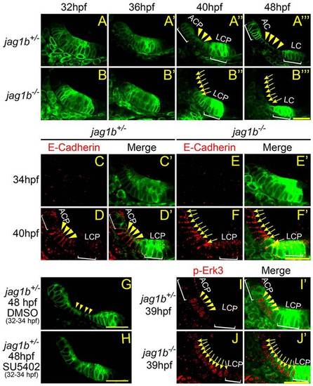 The anterior and lateral cristae are developed from a single anterior prosensory domain. (A-B′′′) Time-lapse imaging of the anterior pro-sensory domain development in jag1b+/- and jag1b-/- embryos. In jag1b-/- embryos, ACP and cells in the middle of the anterior prosensory domain undergo morphological change (B′′,B′′′, arrows). ACP, anterior crista primordia; LCP, lateral crista primordia; AC, anterior crista; LC, lateral crista. Arrows and arrowheads indicate cells undergoing morphological change. (C-F′) E-cadherin immunofluorescence staining in jag1b+/- and jag1b-/- embryos. At 40hpf, only cells in the middle of the anterior prosensory domain express E-cadherin in jag1b+/- embryos (D,D′, arrowheads). In jag1b-/- embryos, ACP and cells in the middle of the anterior prosensory domain express E-cadherin (F,F′, arrows). (G,H) Treatment with FGF inhibitor SU5402 at 32-34hpf blocks the separation of anterior and lateral cristae in jag1b+/- embryos. (I-J′) pErk3 immunofluorescent staining in jag1b+/- and jag1b-/- embryos. Dorsolateral views. Scale bars: 20µm. Anterior towards the left and dorsal upwards. Arrows and arrowheads indicate staining of E-Cadherin or p-Erk3. |