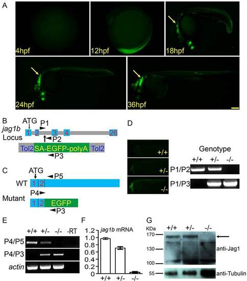 jag1b gene expression is blocked in the gene-trapping jag1b mutant. (A) EGFP expression patterns in jag1b+/- embryos. EGFP is expressed in the otic vesicle (arrows). Scale bar: 100µm. (B) The zebrafish jag1b genomic locus. Primers used in D are indicated. (C) The mature wild-type (WT) jag1b transcript and the predicted mutant jag1b-EGFP fusion transcript. Primers used in E are indicated. (D) PCR genotyping confirms that the jag1b gene is disrupted in jag1b mutants (right). Wild type, heterozygotes and homozygotes show different GFP intensity (left). (E) RT-PCR analysis confirms the existence of the jag1b-EGFP fusion transcript in jag1b+/- and jag1b-/- embryos. (F,G) Real-time RT-PCR (F) and western blot (G) analyses indicate that jag1b mRNA and protein levels are decreased in jag1b mutant embryos. Error bars indicate s.e.m. of triplicated experiments. |