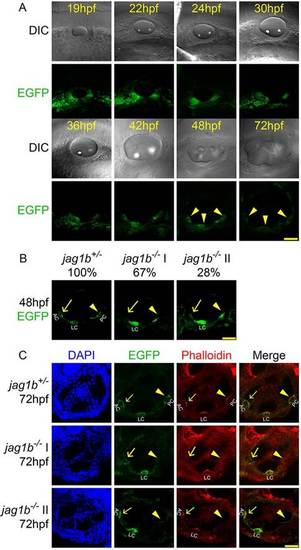 Anterior and posterior semicircular canal cristae are lost in jag1b-/- mutants. (A) High resolution EGFP expression patterns in the otic vesicle of jag1b+/- embryos. Images taken at 30hpf-48hpf are dorsolateral views. Other images are lateral views. (B,C) Confocal imaging (B) and phalloidin staining (C) of jag1b+/- and jag1b-/- embryos at 48hpf (B) and 72hpf (C). (B) Dorsolateral views. (C) Lateral views. Anterior towards the left and dorsal upwards. Scale bars: 50µm. AC, anterior crista; LC, lateral crista; PC, posterior crista. Arrows and arrowheads indicate sensory crista regions. EXPRESSION / LABELING: