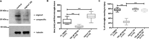 The σ1 receptor allows for microglia to leave the site of damage. (A) σ1-Mo mediated knock-down on protein level. (B) Quantification of time until first microglia cell leaves the site of injury in DMSO compared to PB190 treated embryos with larvae lacking their σ1 receptor. (C) Percentage of microglia reacting to an injury in DMSO and PB190 treated compared to larvae lacking their σ1 receptor and PB190 treated σ1 knock-down embryos. Statistical analysis was performed using a Kruskal-Wallis test with a Dunn’s multiple comparison test. PHENOTYPE: