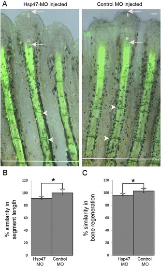 Morpholino mediated knockdown of Hsp47 causes reduced segment length and a small change in bone regenerate length. Calcein staining was used to measure segment length and bone regenerate length in the regenerate. The amputation plane is indicated by a white line. Fin rays treated with targeting or control MO (injected) were measured and compared to their uninjected sides. The ratio of the injected side (targeting MO or control MO) and the control uninjected side, multiplied by 100, is the percent similarity. Percent similarity of greater than 100% reflects the fact that the experimental side can be measurably larger than the control uninjected side. (A) Segment length in Hsp47-MO and Hsp47-5MM injected fins was measured as the distance between the 1st and the 2nd joints (indicated by white arrow heads) distal to the amputation plane. Bone regenerate length was measured as the ratio of the distance of the regenerated length of the calcein stained bone matrix (marked as a) and the total regenerate length (marked as b). The treatment side was normalized against the uninjected side. (B) Bar graph shows reduced segment length following Hsp47 MO injection (p < 0.05). (C) Bar graph shows small but significant reduction in bone regenerate length. The scale bar is 50µm and applies to both panels in A. The student′s t-test was performed (p < 0.05) to determine significance. PHENOTYPE: