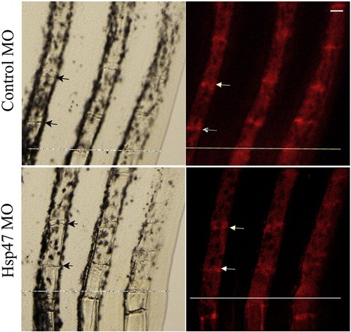 The short segment phenotype following Hsp47-MO treatment is due to formation of premature joints. ZNS5 immunostaining detects osteoblasts and joint-forming cells. Brightfield (left) and ZNS5 immunostaining (right) images are shown. ZNS5 positive joints (indicated by arrows) are observed in both standard control (top row) and targeting MO (bottom row) treated fins. Scale bar is 50µm and applies to all panels. |