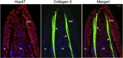 Localization of Hsp47 and Collagen type II in WT-5 dpa fins. Confocal images of a WT-5 dpa longitudinal fin section immunostained with Hsp47 (red) and collagen type II (green) and counterstained with To-pro to detect nuclei (blue). Arrows indicate actinotrichia. ‘ble’ is basal layer of epithelium, ‘e’ epidermis and ‘m’ mesenchyme. Scale bar is 10µm and applies to all panels. EXPRESSION / LABELING:
