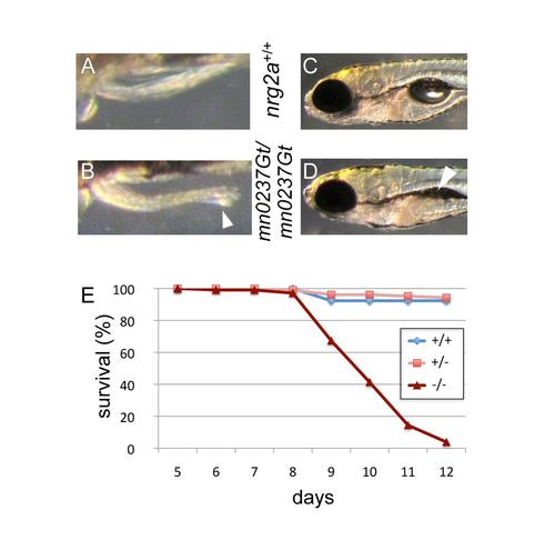 nrg2a mutant larvae have altered pectoral fin folds, lack swim bladders and die between 8 and 12 dpf. (A-D) Images of live larvae at 7 dpf. (A) Wild-type pectoral fin folds (PFF) typically follow a continuous arc such that the PFF edge lies close to the body when larvae are at rest. (B) PFFs in nrg2a mutant larvae (mn0237Gt/mn0237Gt) often depart from a continuous arc shape and/or have thickened edges similar to the MFF phenotype (arrowhead). In addition, wild-type larvae have well-developed swim bladders (C), but swim bladders fail to develop in mn0237Gt/mn0237Gt mutant larvae (D, arrowhead). (E) Graphical illustration of survival rates of mn0237Gt/mn0237Gt mutant larvae (n = 104 larvae per class). |