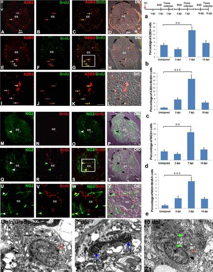Immunohistochemical and ultrastructural analysis of glial progenitors in uninjured and injured zebrafish spinal cord: A-D) A cross section of uninjured cord showing A2B5+ cells (white arrows) in white matter and pial membrane (pm, A and D); BrdU+ cells (red arrow, B); A2B5+/BrdU+ colocalized cells (yellow arrows, C) and DIC image of section C (D). E-H) A 7 dpi cord section showing many A2B5 positive cells (white arrow) in white matter and very few in grey matter (white arrow, E); BrdU+ cells (red arrow, F); A2B5+/BrdU+ colocalized cells (yellow arrow, G) and DIC of section G (H). I-L) Higher magnification of boxed area in G showing A2B5+ cells (white arrows, I); BrdU+ cells (red arrows, J); A2B5+/BrdU+ colocalized cells (yellow arrows, K) and DIC image of section K (L). M-P) An uninjured cord section showing NG2+ bipolar cells (white arrowhead) in the white matter of the cord (M); BrdU+ positive cells (N); NG2+/BrdU+ colocalized cells (yellow arrowhead, O) and DIC image of section O (P). Q-T) A 7 dpi cord section showing many NG2+ cells (white arrowheads) in white matter (Q); BrdU+ cells (green arrowhead, R); NG2+/BrdU+ colocalized cells (yellow arrowhead, S) and DIC image of section R (T). U-X) Higher magnification of boxed area in S showing NG2+ cells (white arrowheads, U); BrdU+ cells (green arrowheads, V); NG2+/BrdU+ colocalized cells (yellow arrowheads, W) and DIC image of section W (X). Y) Ultrastructure of an uninjured cord section showing an oligodendrocyte with many cisternae (black arrowheads) of smooth endoplasmic reticulum (SER), microtubules (MT, red arrows) in the cytoplasm but no intermediate filaments. Z) A 7 dpi cord section showing a proliferating astrocyte progenitor with a prominent dumb-bell shaped compact dividing nucleus (blue arrows) with characteristic heterochromatin body (HC) in the injury site. Z1) A newly formed oligodendrocyte with small cytoplasmic area where microtubules (MT, red arrows) are obvious and a few cytoplasmic organelles (green arrows) like primary lysosome (pLY) is present at the injury site of 10 dpi cord section. Note that axolemma (AXL) is in close vicinity of the cytoplasm. ‘NU’ indicates nucleus of the cell. a) Drawing represents the time frame of SCI, BrdU treatment and tissue collection for cell proliferation experiments. b-e) Quantification of A2B5+ cells (b), A2B5+/BrdU+ cells (c), NG2+ cells (d), NG2+/BrdU+ cells (e) in uninjured, 3 dpi, 7 dpi and 15 dpi cord. The values in bar represents Mean ± s.e.m. (n = 5), statistical significance represented as p value (Student’s t-test; **p<0.01, ***p<0.001). ‘cc’ denotes central canal of the cord. Scale bar = 50 µm (A-H, M-T); 20 µm (I-L, U-X); 1 µm (Y, Z, Z1). |