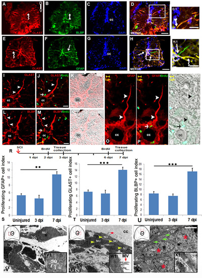 Analysis of radial glial subtypes in uninjured and injured zebrafish spinal cord: A-D) Transverse section of an uninjured cord showing GLAST+ (A, curved arrow), BLBP+ (B, arrow) radial glia counter stained with DAPI (C) and the merge picture (D). D.1) Higher magnification of boxed area of D showing radial glia colocalized with GLAST and BLBP. E-H) Transverse section of an uninjured cord showing GLAST+ (E, curved arrow), GFAP+ (F, arrow) radial glia stained with DAPI (G) and the merge image (H). H.1) Higher magnification of boxed area in section H showing a radial glia colocalized with GLAST and GFAP (curved arrow), and another radial glia stained with only GFAP (arrow). I-K) A section of 7 dpi cord showing GLAST+ radial glia (I, arrowheads), same GLAST+ radial glia colocalized with BrdU (J, small arrow) and its DIC image (K). L-N) A 7 dpi cord section showing BLBP+ radial glia (L, arrowheads), same BLBP+ radial glia colocalized with BrdU (M, small arrow) and its DIC image (N). O-Q) Higher magnification of a 7 dpi cord section showing GFAP+ radial glia with its process emerged from central canal (cc) towards pial membrane (O, arrowheads), same GFAP+ radial glia colocalized with BrdU (P, arrow) and its DIC image (Q). R) Drawing represents the time frame of SCI, BrdU treatment and tissue collection for cell proliferation experiments. S-U) Representative bar graph indicate quantification of GFAP+/BrdU+ cells (S), GLAST+/BrdU+ cells (T), BLBP+/BrdU+ cells (U) in uninjured, 3 dpi and 7 dpi cord. Values represent as mean ± s.e.m. (n = 5). Statistical significance represented as p value (Student’s t-test; **p<0.01, ***p<0.001). V and V1) Ultrastructure of a young glial progenitor cell with cytoplasmic processes containing intermediate filaments (white arrow, IF) and glycogen granules (white lines, GG) resembling radial glia in the ependymal region of a 7 dpi cord section. Inset V1 showing glycogen granules in the cytoplasm of a radial glia like cells also shown in V. W and W1) Ultrastructure of a 7 dpi cord section at the stump region shows aggregation of many ependymal cells (yellow arrowheads) with conspicuous microvilli (red arrow) protruding towards the central canal (cc). Inset W1 showing higher magnification of an ependymal cells with microvilli (MV, red arrow). X and X1) A 7 dpi cord section in the grey matter region showing many cytoplasmic processes of glia (green arrows) with compact intermediate filaments (IF) in the close vicinity of newly formed cells (red stars). Inset X1 indicating intermediate filaments in glial cytoplasm. In the insets, red boxed area inside the cartoon of injured spinal cord indicates the anatomical location of ultrastructural images. ‘NU’ and ‘CY’ denote nucleus and cytoplasm of the cell anatomy respectively. Scale bar = 50 µm (A-D, E-H); 20 µm (D.1, H.1); 15 µm (I-K, L-N); 5 µm (O-Q); 2 µm (V-X); 200 nm (V1-X1). |