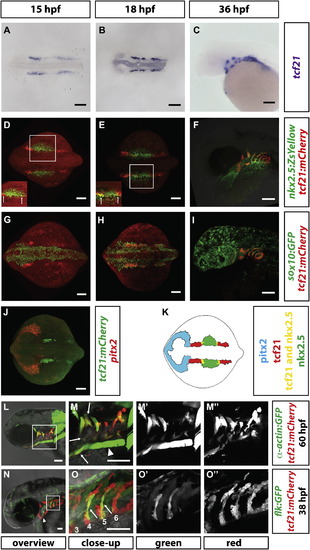 Expression of tcf21 during Head Formation (A–C) Staining of tcf21 mRNA in wild-type embryos of indicated stages. n > 7. (D–I) Images of fixed embryos of the indicated stages and genotypes stained for mCherry and ZsYellow proteins (D–F) or mCherry and GFP (G–I). White squares in (D) and (E) indicate region shown with increased intensity to demonstrate domain overlap in insets in (D) and (E). sox10:GFP was used to mark the neural crest contribution to the pharyngeal arches. Arrows in insets indicate region where tcf21 and nkx2.5 are co-expressed. n = 5 for (D) and (E); n = 1 for (F); n = 5 for (G); n = 2 for (H); n = 1 for (I). (J) Staining of pitx2 mRNA and mCherry protein in a 15-somite stage embryo (n = 13). (K) Schematic summary of pitx2, tcf21, and nkx2.5 expression in the head mesoderm in the 14-somite stage embryo. Note that in this study, the term “head mesoderm” refers to the mesoderm comprised of the prechordal plate mesoderm, the pharyngeal mesoderm, and the cardiac mesoderm. Pitx2, tcf21, and nkx2.5 mark—possibly only parts of—the prechordal plate, pharyngeal mesoderm, and pharyngeal mesoderm/secondary heart field mesoderm, respectively. (L–M′′) Live images of 60 hpf embryos carrying indicated transgenes. Square in (L) indicates magnified region in (M). (M′) and (M′′) show single fluorescent channels. Arrows in (M) indicate some of the tcf21+ muscles. Note that the prechordal plate-derived extraocular muscles (asterisk in M) and the somite-derived sternhyoideus muscles (arrowhead in M) do not express tcf21. (N–O′′) Live images of 38 hpf embryo carrying indicated transgenes. Square in (N) indicates magnified region in (O). (O′) and (O′′) show single fluorescent channels. Arrowhead in (N) indicates the HA progenitors. Arrows in (O) indicate tcf21+ pPAA progenitors, and the numbers label the arches. Note that the flk:GFP transgenic line weakly labels the pharyngeal endoderm and that PAA3 has already formed and lumenized and therefore is difficult to see in this projection. Scale bars represent 100 µm (A–J, L, and M) or 50 µm (N and O). Anterior is to the left. Dorsal views (A, B, D, E, G, H, and J) and lateral views (C, F, I, and L–O). EXPRESSION / LABELING: