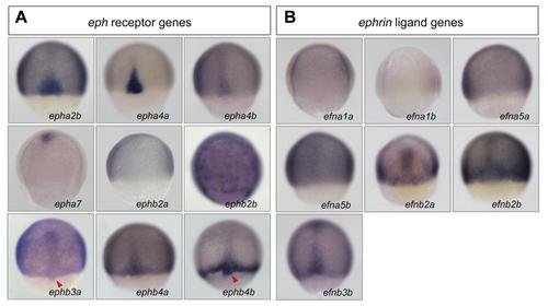 Expression patterns of Eph receptor and ligand genes in zebrafish gastrulas. Wild-type embryos were collected around 75% ES and probed with indicated gene probes. All embryos were dorsally viewed with animal pole to the top. Arrowheads indicated DFCs. |