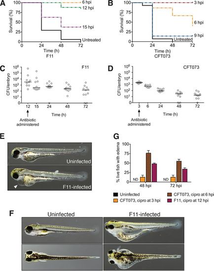 Survival of ExPEC-infected embryos varies with ciprofloxacin treatment. (A and B) Kaplan-Meier survival curves of zebrafish embryos injected via the circulation valley with F11 (A) or CFT073 (B) and then treated with ciprofloxacin at the times indicated; n = 15 to 20 embryos. Black solid lines show untreated controls. (C and D) Bacterial titers recovered from F11 (C)- and CFT073 (D)-infected embryos before and after treatment with ciprofloxacin at 12 or 3 hpi, as indicated. Bars denote the median values of the groups; n ≥9 embryos pooled from two independent experiments. (E and F) Uninfected controls and F11-infected embryos at 24 (E) and 72 (F) hpi. Both control and F11-infected zebrafish were treated with ciprofloxacin beginning at 12 hpi. The arrowhead in panel E indicates the presence of pericardial edema in a surviving F11-infected embryo. (G) Percentages of surviving embryos with overt signs of edema at 48 and 72 hpi of the bloodstream with F11 or CFT073. Ciprofloxacin was administered at 3, 6, or 12 hpi, as indicated. Uninfected controls were treated with ciprofloxacin at the same time points. Bars represent mean data ± the standard error of the mean from two independent experiments; total n = 30 to 40 fish. ND, not detected. PHENOTYPE:
