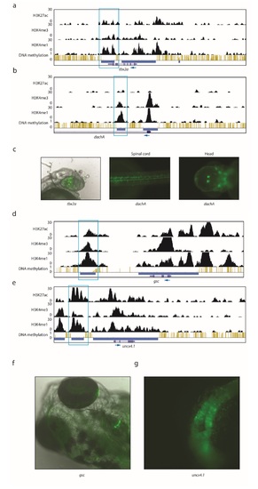 Hypo-enhancers show reproducible expression pattern in enhancer assays. (a,b) Genome browser views of the two hypo-enhancers used in panel c. ChIP-Seq data and DNA methylation data are displayed as indicated from 4hpf old embryos. Normalized ChIP-Seq enrichments and fractional methylation are indicated at the left site of the image. Blue box indicates the hypo-enhancer. The blue arrow indicates the orientation of the gene. Blue horizontal bars indicate HMRs. (c) in vivo enhancer assay of hypo-enhancers located within 20kb of the indicated genes (see genome browser view S2a,b). The images were taken 24hpf and 48hpf of tbx2a and dachA respectively. (d,e) Genome browser view of the two hypo-enhancers tested in f and g. ChIP-Seq data and DNA methylation data are displayed as indicated from 4hpf old embryos. Normalized ChIP-Seq enrichments and fractional methylation are indicated at the left site of the image. Blue box indicates the hypo-enhancer. The blue arrow indicates the orientation of the gene. Blue horizontal bars indicate HMRs. (f,g) in vivo enhancer assay of hypo-enhancers located within 20kb of the indicated genes. The images were taken 3dpf and 10hpf of gsc and unxc4.1, respectively. |