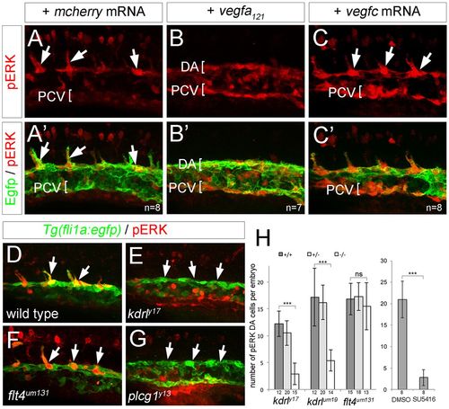 ERK phosphorylation in sprouting ISVs requires Vegfa signaling. (A-G) Confocal images of Tg(fli1a:egfp)y1 embryos at 21 hpf (A-C′) and 20 hpf (D-G) immunostained for GFP (green) and pERK (red). Lateral views, anterior to the left, dorsal is up. Number of analyzed embryos is indicated, representative images are shown. Embryos were injected with 100 pg mcherry mRNA (A,A′), 25 pg vegf121 mRNA (B,B′) or 100 pg vegfc mRNA (C,C′). (D) Wild-type embryo. (E) kdrly17 mutant embryo. (F) flt4um131 mutant embryo. (G) plcg1y13 mutant embryo. Arrows indicate pERK-positive cells, or lack thereof. (H) Graph showing number of pERK+ endothelial cells per embryo at 20 hpf in a defined segment of the DA in kdrl and flt4 mutant embryos, or in embryos treated with 10 µM SU5416. Number of embryos for each genotype or treated with compound is indicated on the x-axis. Error bars represent s.d.; ***P<0.001; ns, not statistically significant. EXPRESSION / LABELING: