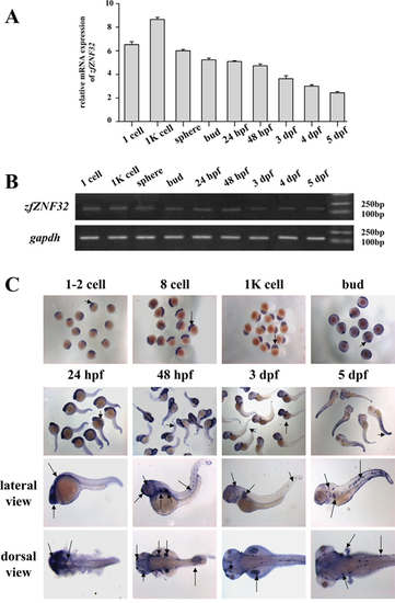 ZfZNF32 expression pattern during early embryonic development. A. ZfZNF32 mRNA was distributed uniformly from the zygote stage to the larval stage according to Q-PCR. B. Agarose gel electrophoresis of the (A) PCR product. C. Whole-mount in situ hybridization revealed the dynamic expression of zfZNF32 during zebrafish development (from the 1 cell stage to 5 dpf), and zfZNF32 was mainly restricted to the nervous system and pectoral fin (lateral view and dorsal view), as indicated by arrows. |