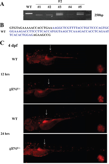 Establishment of zfZNF32 knock-out zebrafish and lateral line system regeneration. A. Agarose gel electrophoresis showing the Cas9-mediated zfZNF-/- with bases deleted compared with WT. B. A total of 85 bp were deleted (in blue font) in the zfZNF-/-. C. The regenerative capacity of the lateral line system was increased in 4 dpf zfZNF-/- at 12 and 24 hrs after neomycin treatment. Hair cells in the lateral line were stained with DASPEI (red fluorescence). The L1 was chosen as the representative regenerating neuromast, as indicated by arrows, and shown in the lower right corner of each figure with 200×magnification. PHENOTYPE: