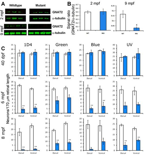 Reduction of GNAT2 protein and cone density in EYS-deficient zebrafish. Western blotting for GNAT2 was performed on retinal lysates from 2 mpf and 9 mpf zebrafish. Cone density was determined by counting 1D4-, green opsin-, blue opsin-, and UV opsin-positive cells in the dorsal and ventral retina. (A) Western blot for GNAT2 and α-tubulin. Note that while GNAT2 signal was not changed in 2 mpf mutant zebrafish, it was diminished in 9 mpf mutant zebrafish. (B) Quantification of western blot shown in A. *P<0.05, Student's t-test, two-tailed. Error bars indicate SEM (standard error of the mean). (C) Cone density in EYS-deficient zebrafish was normal at 40 dpf but reduced at 6 and 8 mpf. *P<0.05; **P<0.01 (repeated measures ANOVA). Error bars indicate s.e.m. EXPRESSION / LABELING: