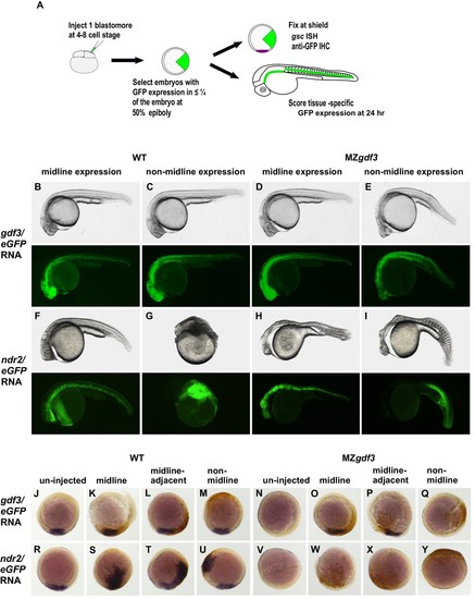 Gdf3 and Nodal must be co-expressed in lineages fated to become dorsal midline tissues.The site of ectopic Nodal/Gdf3 signaling influences the efficacy of MZgdf3 mutant rescue and the severity of overexpression phenotypes in WT embryos. (A) Experimental Approach: 4–8 cell WT and MZgdf3 embryos were injected with 5 pg ndr2 RNA +25 pg eGFP RNA or with 50 pg gdf3 RNA +25 pg eGFP RNA. At 50% epiboly embryos expressing eGFP in 25% or less of the blastoderm were selected. These embryos were grown until 24 hpf and photographed with transmitted light and fluorescent illumination or were grown until shield stage and processed by WISH with a gsc probe then by IHC with anti-GFP. (B, C) 24 hpf WT embryos injected with gdf3/eGFP RNA had normal phenotypes, regardless of whether (B) midline or (C) non-midline lineages were targeted. (D) MZgdf3 embryos expressing Gdf3/eGFP in dorsally-derived midline lineages including the notochord and polster showed complete morphological rescue of notochord, somites, brain and eyes. (E) MZgdf3 embryos with expression of Gdf3/eGFP in non-midline lineages including the skin and somites showed rescue of somites and notochord but lacked normal development of anterior neural tissues and eyes. (F) Expression of Ndr2/eGFP in dorsal midline lineages in WT embryos resulted in embryos that were predominantly normal but some exhibited slightly narrower head and trunk and kinked notochords. This is strikingly distinct from (G) expression of Ndr2/eGFP outside midline lineages, which strongly dorsalized the embryos, or from ubiquitous expression in WT embryos injected with ndr2 RNA at the 1–2 cell stage (Figure 3S–U). (H, I) MZgdf3 embryos injected with ndr2/eGFP RNA showed no rescue of the MZgdf3 mutant phenotype regardless of what lineages were targeted. (J–Y) Shield stage embryos that were injected at the 4–8 cell stage with the indicated RNAs were processed by WISH for gsc and by IHC for GFP. Purple cells express gsc RNA; brown cells express GFP from RNA injection. Panels show embryos representative of each phenotypic class. (J–M) WT embryos at shield stage that were injected with gdf3/eGFP RNA showed no alteration in, or ectopic expression of gsc regardless of the location of expressing cells. (N–Q) MZgdf3 embryos injected with gdf3/eGFP RNA showed rescue of gsc expression when the expressing cells were located at (O), or adjacent to the presumptive dorsal shield (P). (R–U) WT embryos injected with ndr2/eGFP RNA showed ectopic gsc expression associated with the clone of expressing cells, regardless of the location of these cells within the embryo. (V–Y) MZgdf3 embryos injected with ndr2/eGFP RNA were unresponsive to this nodal ligand and showed no gsc expression. Note: Due to the lack of gsc expression, the location of the GFP-expressing clone of cells relative to the dorsal axis could not be reliably assigned in these embryos. |