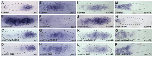 Rescue of the delayed dynamics of Wnt Fgf signaling systems in snail1b morphants by coinjection of snail1b mRNA. Expression of lef1 (A), pea3 (E), cxcr4b (I) and cxcr7b (M). lef1 (B) and cxcr4b (J) are expanded into the trailing domain (B), pea3 (F) and cxcr7b (N) are not well established in the trailing domain of snail1b-MO. Injection of snail1b mRNA along with snail1b- TB MO restores the expression patterns of lef1 (C), pea3 (G), and cxcr7b (O). However, restricted cxcr4b expression is not restored (K). Injected of snail1b mRNA alone does not have any obvious effect on these signaling systems (D, H, L, P). |