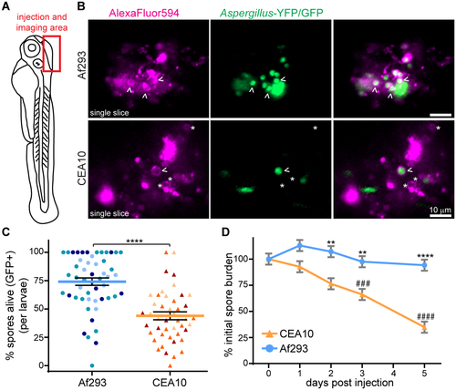 A CEA10-derived strain is killed more than an Af293-derived strain in vivo. A. Schematic of 2 dpf zebrafish larvae. Area of Aspergillus spore injection (hindbrain) and imaging is indicated. B, C. TBK1.1 (Af293) or TFYL49.1 (CEA10) spores express YFP or GFP and have AlexaFluor594 conjugated to the spore cell wall. 2 dpi larvae were imaged and the percentage of spores killed (GFP+/total) was quantified. Representative images of single z slices (B) and quantification over three experiments (C) are shown. Arrowheads indicate alive spores, asterisks indicate killed spores. Scale bar represents 10 μm. Each symbol represents one larvae, color-coded by experiment. Lines represent lsmeans ± SEM. Af293 n = 51, CEA10 n = 45. D. Fungal burden was monitored by CFU platings from single homogenized larvae infected with TBK1.1 (Af293) or TFYL49.1 (CEA10). CFUs from 24 larvae (3 replicates, 8 larvae each) per condition per day were measured. Average injection CFUs: Af293 = 150, CEA10 = 140. For all analyses, data represent lsmeans ± SEM from three pooled experiments, P values calculated by ANOVA. Asterisks represent significance between strains, # represent significance compared to day 0. See also S1 Fig. |