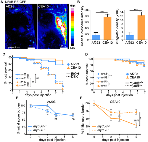Inflammatory activation is required for clearance of a CEA10-derived strain. A, B. NF-κB RE:EGFP larvae were infected with non-fluorescent TJW55.2 (Af293) or CEA17 KU80Δ (CEA10) spores and imaged 2 dpi. Representative images (A) and quantification from three pooled experiments (B) are shown. Scale bar represents 50 μm. CEA10 n = 22; Af293 n = 26. C. Larvae were treated with dexamethasone (DEX) or ethanol (EtOH) vehicle control directly after infection with TFYL81.5 (Af293) or TFYL49.1 (CEA10), and larval survival was monitored. Average injection CFUs: Af293 = 34, CEA10 = 33. D-F. myd88-/- or control larvae were infected with TBK1.1 (Af293) or TFYL49.1 (CEA10) and larval survival and/or fungal burden was monitored. Fungal burden was determined by CFU platings from single homogenized larvae. Asterisks represent significance between myd88-/- and control larvae, # represent significance compared to day 0. Average injection CFUs: D, F: Af293 = 27, CEA10 = 32; E: Af293 = 66. For all analyses, data represent 3 pooled replicates. For CFU experiments, CFUs from 24 larvae (8 larvae per replicate) per condition per day were measured. Intensity values and CFU analyses represent lsmeans ± SEM from three pooled experiments, P values calculated by ANOVA. P values for survival analyses calculated by Cox proportional hazard regression analysis. See also S2 Fig. |