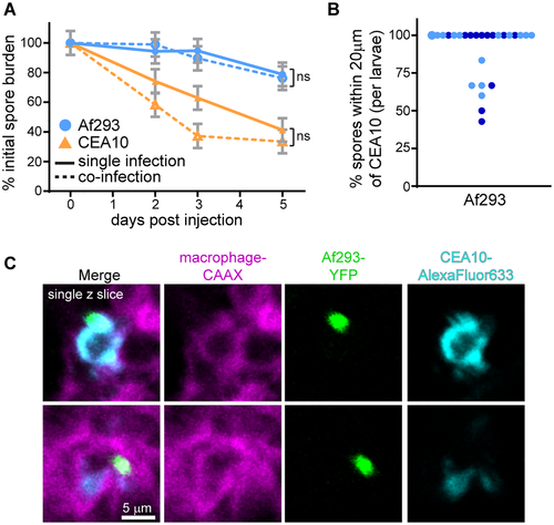 CEA10-induced inflammatory activation is not sufficient for killing of an Af293-derived strain. A. Fungal burden was monitored by CFU platings from single homogenized larvae infected either singly with TFYL49.1 (CEA10) or TBK5.1 (Af293) or co-infected with both strains. Average injection CFUs: Af293 = 53, CEA10 = 47, co-infection = 21 Af293 + 27 CEA10. CFUs from 24 larvae (8 larvae per replicate) per condition per day were measured; lsmeans ± SEM are shown from three pooled experiments, P values calculated by ANOVA. B, C. Macrophage-membrane labeled larvae (mfap4:tomato-CAAX) were co-infected with YFP-expressing TBK1.1 (Af293) and AlexaFluor633-labeled CEA17 KU80Δ (CEA10) and imaged 1 dpi. Percentage of Af293 spores within 20 μm of a CEA10 spore in each larvae from two replicates was quantified (B). Each point represents one larvae, color-coded by replicate. Single z-slice images from a representative larvae (C) are shown. Scale bar represents 5 μm. See also S3 Fig. |
