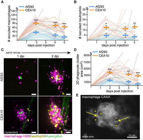 Macrophages form tight clusters around A. fumigatus. A-D. Dual macrophage-nuclear (mpeg1:mcherry-H2B) and neutrophil (lyz:BFP) labeled larvae were infected with YFP- or GFP-expressing A. fumigatus TBK1.1 (Af293) or TFYL49.1 (CEA10) strains and imaged days 1–5 post injection. Macrophage (A) and neutrophil (B) recruitment as well as phagocyte cluster size (D) were quantified. Representative images (C, scale bar represents 20 μm) and pooled quantification from 3 experiments (A, B, D) are shown. Each line in graphs represents one larvae followed for the entire course of infection, lines are color-coded by replicate, bars represent pooled lsmeans ± SEM, P values calculated by ANOVA. Af293 n = 25, CEA10 n = 27 for macrophage and cluster area quantification; Af293 n = 17, CEA10 n = 18 for neutrophil quantification. E. Macrophage-membrane (mfap4:tomato-CAAX) labeled larvae were infected with CEA17 KU80Δ (CEA10) and imaged 3 dpi. Asterisks represent cell nuclei, arrows indicate cell-cell junctions. Scale bar represents 10 μm. See also S4 Fig. |