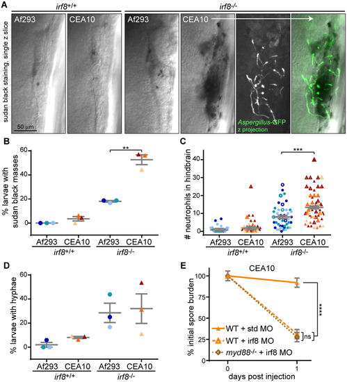 More neutrophils are recruited to a CEA10-derived strain than an Af293-derived strain in the absence of macrophages. A-D. Macrophage-deficient (irf8-/-) or control (irf8+/+) larvae were infected with YFP- or GFP-expressing A. fumigatus TBK1.1 (Af293) or TFYL49.1 (CEA10) strains, fixed 1 dpi, and stained for neutrophils (sudan black). Representative images are shown (A, scale bar represents 50 μm) and percent of larvae per experiment with sudan black masses (B), number of neutrophils at infection site (C), and percent of larvae per experiment with A. fumigatus hyphae (D) were quantified. N>9 larvae each condition each replicate. For percentage of larvae with sudan black masses or hyphae (B, D), each symbol represents one replicate, bars represent means ± SEM, P values calculated by t test. For neutrophil number quantification (C), each symbol represents one larvae. Larvae with sudan black masses where neutrophil numbers were difficult to count and represent underestimations are denoted with open symbols. Bars represent lsmeans ± SEM from 3 pooled replicates, P values calculated by ANOVA. All symbols are color-coded by replicate. E. Wild-type or myd88-/- embryos were injected with control (std) or macrophage-depleting (irf8) morpholinos. Larvae were then infected with TFYL49.1 (CEA10) spores and CFUs were measured. Average injection CFUs = 38. CFU data represent lsmeans ± SEM of 3 pooled replicates, n = 24 larvae (3 replicates, 8 larvae each) per condition per day, P values calculated with ANOVA. See also S7 Fig. |