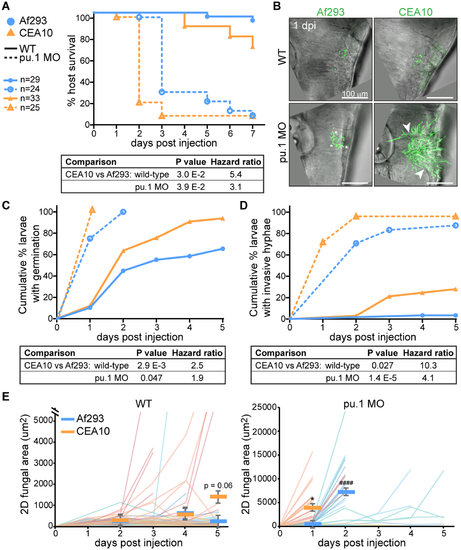 A CEA10-derived strain germinates faster than an Af293-derived strain in vivo. Wild-type or phagocyte-deficient (pu.1 morpholino) larvae were infected with YFP- or GFP-expressing A. fumigatus TBK1.1 (Af293) or TFYL49.1 (CEA10). All graphs represent data from 3 pooled replicates, Ns and labels noted in (A) are applicable for all data. A. Larval survival was monitored, P values calculated by Cox proportional hazard regression analysis. B-E. Larvae were imaged days 1–5 post injection and fungal growth was measured. Representative z-projection images 1 dpi are shown (B). Scale bar represents 100 μm. Asterisks indicate examples of germinated spores, arrowheads indicate examples of invasive hyphae. Cumulative percent of larvae with germinated spores (C) and with invasive hyphae (D) was calculated, P values were calculated by Cox proportional hazard regression analysis. 2D GFP+ fungal area was measured from maximum intensity projection images of individual larvae for 5 days of infection (or until larvae succumbed) (E). Each line represents one larvae followed for the entire course of infection, lines are color-coded by replicate, bars represent pooled lsmeans ± SEM, P values were calculated by ANOVA. See also S8 Fig. |