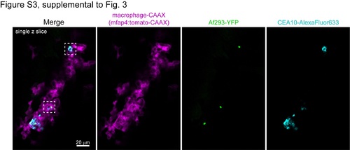 Af923- and CEA10-derived spores co-localize when co-injected. Macrophage-membrane labeled larvae (mfap4:tomato-CAAX) were co-infected with YFP-expressing TBK1.1 (Af293) and AlexaFluor633-labeled CEA17 KU80Δ (CEA10) and imaged 1 dpi. A single z-slice image containing the entire hindbrain region of a representative larvae is shown. Scale bar represents 20 μm. Boxes indicate regions shown at higher magnification in Fig 3C. |