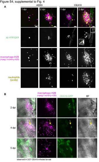 Imaging of phagocyte clusters. A. Individual channels of images from Fig 4C are shown. Representative z projection images of dual macrophage-nuclear (mpeg1:mcherry-H2B) and neutrophil (lyz:BFP) labeled larvae infected with YFP- or GFP-expressing A. fumigatus TBK1.1 (Af293) or TFYL49.1 (CEA10) strains and imaged days 1 and 2 post injection. Scale bar represents 20 μm, inset scale bar represents 5 μm. Examples of spore germination inside the cluster are marked in insets with arrowheads. B. Nuclear macrophage labeled larvae (mpeg1:mcherry-H2B) were infected with GFP-expressing TFYL49.1 (CEA10). Z-projection (mcherry, GFP) or single slice (BF) images of the same larvae on days 2, 4, and 5 dpi are shown. Extrusion at 4 dpi is marked with an arrow. Scale bar represents 50 μm. |
