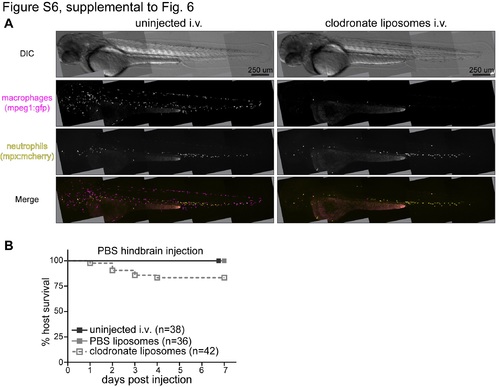 Clodronate liposomes specifically deplete macrophages. A. Dual macrophage (mpeg1:GFP) and neutrophil (mpx:mCherry) labeled larvae were injected with clodronate liposomes, or left uninjected, and imaged 24 hours later. Z-projection (GFP, mcherry) or single slice (BF) images are shown. Scale bar represents 250 μm. B. PBS was injected into the hindbrains of clodronate liposome-injected or control (PBS liposomes and/or uninjected i.v.) larvae and survival was monitored. Data shown are from 3 pooled replicates. |