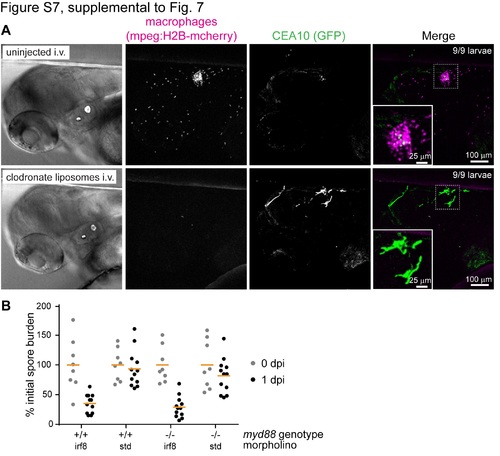 Macrophage depletion leads to more germination and clearance of a CEA10-derived strain. A. Macrophage-depleted (clodronate liposomes) or control (uninjected i.v.) larvae were infected with GFP-expressing TFYL49.1 (CEA10) and imaged 1 dpi. Z-projection (mcherry, GFP) or single slice (BF) images shown are representative of 9/9 larvae from each condition from one experiment. Scale bar represents 100 μm or 25 μm (inset). B. Wild-type or myd88-/- embryos were injected with control (std) or macrophage-depleting (irf8) morpholinos. Larvae were then infected with TFYL49.1 (CEA10) spores and CFUs were measured. Data are from one experiment, each symbol represents one larva. These data are also included in the pooled data from three replicates shown in Fig 7E. |