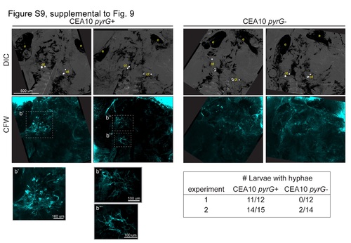 pyrG- strains are deficient in germination in larval zebrafish. Phagocyte-deficient larvae (pu.1 morphant) were infected with non-fluorescent spores of CEA17 KU80Δ (CEA10 pyrG+) or CEA17 (CEA10 pyrG-). 1 dpi A. fumigatus growth was visualized in flattened larvae with calcofluor white (CFW) staining and representative widefield images are shown. e = eye, ot = otic vesicle. Number of larvae with hyphal growth in 2 replicates was quantified. |