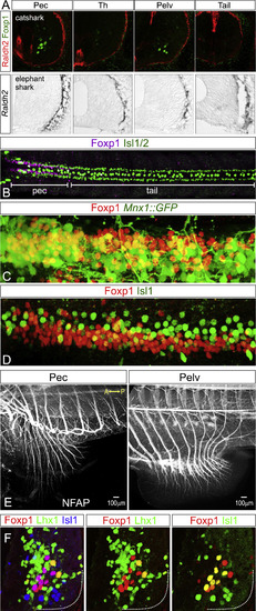 Development of Fin MNs in Danio rerio, Scyliorhinus canicula, and Callorhinchus milii, Related to figure 3 (A) Raldh2 expression is not detected in fin-level MNs of catshark (Scyliorhinus canicula) or elephant shark (Callorhinchus milii). In both species, expression of Raldh2 is detected in the tissue surrounding the spinal cord, similar to the pattern observed in mice. (B) Dorsal view of 48hpf zebrafish embryo showing Foxp1 expression at pectoral (pec) levels. Isl1 staining labels a subset of MNs as well as larger diameter sensory neurons. Foxp1 expression in the ventral spinal cord extends from the hindbrain to the rostral spinal cord, adjacent to myotomes m2-m5, consistent with previous studies (Ma et al., 2010). (C and D) High-magnification images of Foxp1 protein expression at pectoral levels in zebrafish, showing colocalization with Mnx1::GFP (at 72 hpf) and Isl1 (at 48 hpf). In zebrafish a subset of Foxp1+ neurons express Isl1 at relatively weak levels. (E) Whole-mount NFAP staining showing projection of motor axons toward the pectoral and pelvic fin in catshark. (F) Sections of catshark embryos showing a subset of Foxp1+ MNs express Isl1 or Lhx1. In catshark LMCm and LMCl neurons appear to be intermixed. |