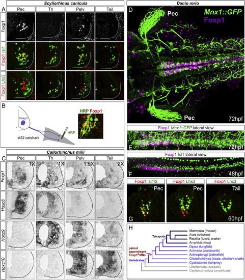 LMC Neurons Are Present in Multiple Species of Aquatic Vertebrates (A) Expression of MN determinants in the small-spotted catshark, Scyliorhinus canicula, at st31. Foxp1+ MNs are detected at fin levels but are absent in inter-fin (“Th”) and tail levels. Lhx3+ MMC-like neurons are present at all levels and lack Foxp1. (B) Retrograde labeling of MNs after HRP injection into the pectoral fin in Scyliorhinus. Foxp1+ MNs co-label with HRP. (C) In situ hybridization showing expression of MN markers and Hox genes in Callorhinchus milii at st31. Foxp1 is detected at fin levels and also at inter-fin and tail levels, possibly reflecting spinal INs. Hoxc6 is expressed at pectoral levels, Hoxc9 at inter-fin levels, and Hoxc10 at pelvic fin levels. Differences in relative image magnification are shown. (D–G) Expression of MN determinants in zebrafish. (D) Dorsal view of a 72-hpf Mnx1::GFP embryo showing expression of Foxp1 at pectoral levels. GFP also labels projections to the pectoral (Pec) fin. Foxp1 is expressed in INs at more caudal segments. (E) Lateral view showing coexpression of GFP in a subset of Foxp1+neurons. (F) Lateral view of 48-hpf embryo showing Foxp1 and Isl1 expression. (G) Transverse sections showing that Foxp1+ neurons lack Lhx3. (H) Simplified chordate phylogeny indicating the presence of a limb/fin innervation program in the common ancestor to skates and tetrapods. |