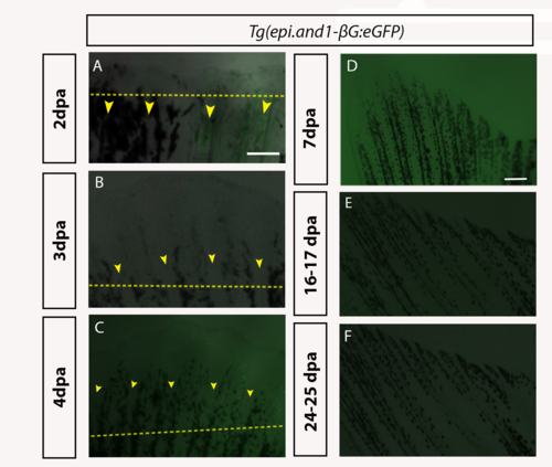 Time course analysis of eGFP in Tg(epi.and1-βG:eGFP) throughout regeneration.Regenerative time course analysis of in vivo reporter expression of Tg(epi.and1-βG:eGFP) (n = 25 fish/line, 2 lines) at 2dpa (A), 3dpa (B), 4dpa (C), 7dpa (D), 16-17dpa (E) and 24-25dpa (F). (A-F) There is a complete absence of reporter expression throughout regeneration. All scale bars = 200μm. |