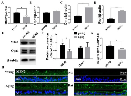 Mitochondrial fusion/fission imbalanced in aging zebrafish retinas. (A-D) Mfn2, Opa1, Oma1, and Fis1 expression in young and aging zebrafish retinas. Graphs represent (A) Mfn2, (B) Opa1, (C) Oma1, and (D) Fis1 gene expression by quantitative real-time PCR (mean ± SEM, *P<0.05, ***P<0.001, ****P<0.0001, n=3. (E) Representative western blot showing the protein expression levels of Mfn2 and Opa1 in young and aging zebrafish retinas. (F) The graph depicts the densitometric mean and SEM normalized to the corresponding level of the loading control protein beta-tubulin (*P<0.05, n=3). (G) The ratio of Opa1-L/Opa1-S, as determined by densitometry of western blots as in E (*P<0.05, n=3. (H) Immunofluorescence localization and relative expression of Mfn2 in the RGC layer of young and aging zebrafish retina cross-sections. All photographs were taken at 40x magnification except rat sections were at 20x magnification. Young, 4-6 months old zebrafish; aging, 19-23 months old zebrafish; NC, negative control (no primary antibody); Rat, rat retina positive control; Opa1-L, Opa1 long segment; Opa1-S, Opa1 short segment; GCL, ganglion cell layer.