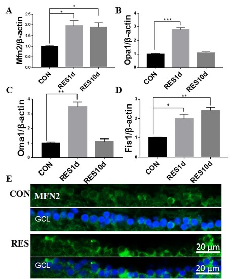 Resveratrol treatment increased mitochondrial fusion/fission expression in young zebrafish retina. (A-D) Mfn2, Opa1, Oma1, and Fis1 gene expression after resveratrol treatment for 1 or 10 days as determined by quantitative real-time PCR (mean ± SEM, *P<0.05, **P<0.01, ***P<0.001 compared to control (CON), n=3). (E) Immunofluorescence localization and relative expression of Mfn2 in the RGC layer of adult zebrafish retina cross-sections after 10 days resveratrol treatment. All photographs were taken at 40x magnification. CON, control; RES1d, resveratrol treated for 1 days; RES/RES10d, resveratrol treated for 10 days; GCL, ganglion cell layer.